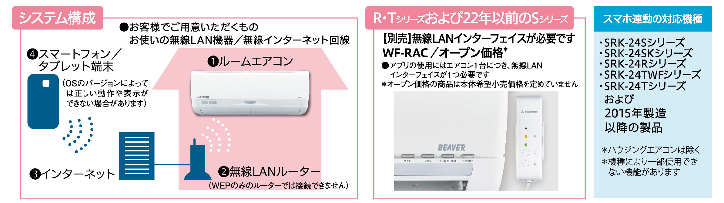 | リモート操作 | スマートフォン連動(注2) | 無線LAN インターフェイス | 内蔵 | 内蔵 | T:別売 TWF:内蔵 |